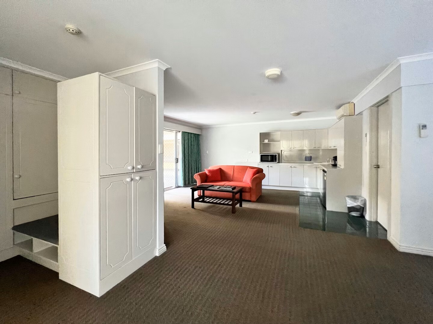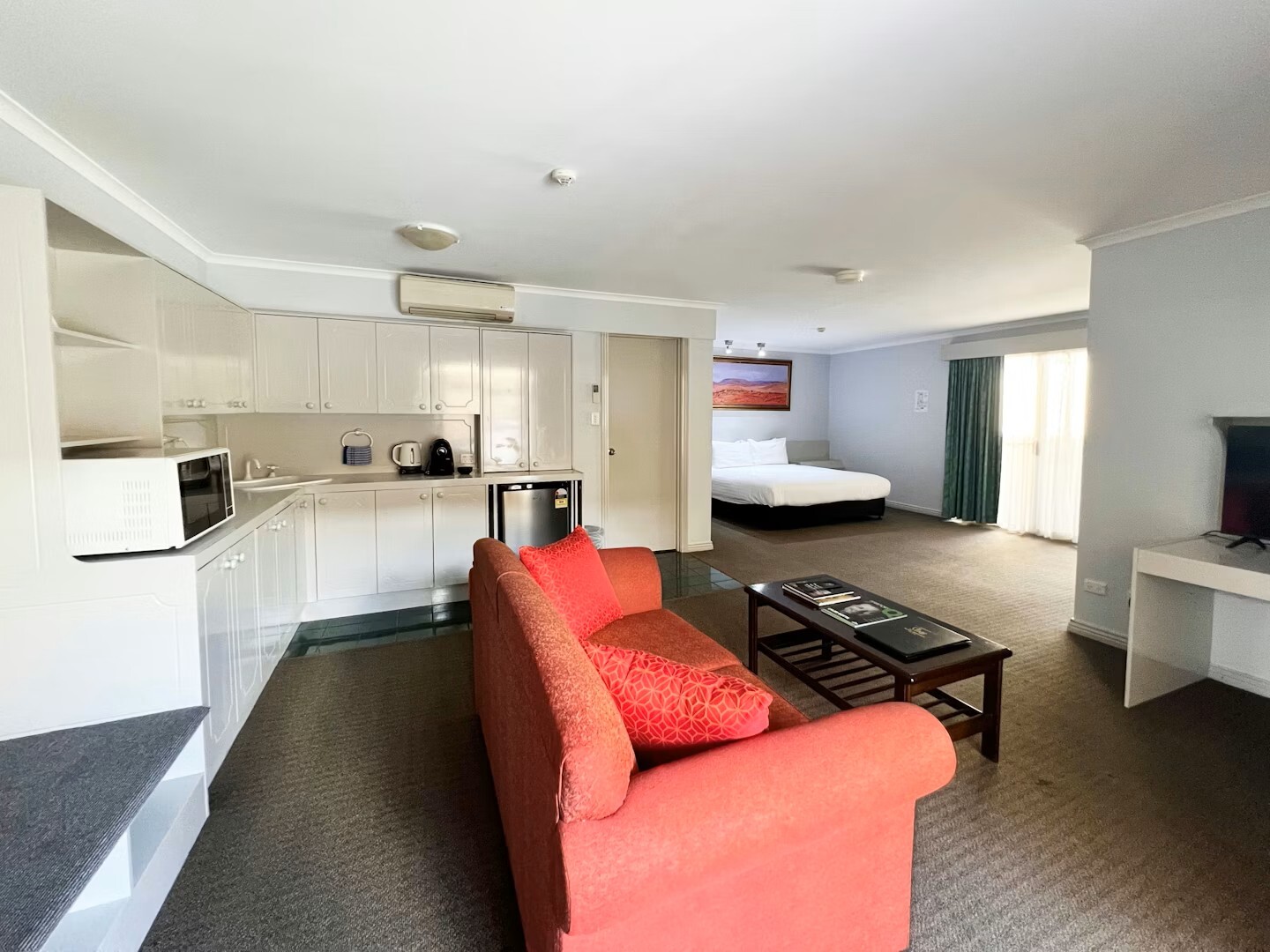 Our Deluxe King Studio Apartment is located on the upper level at the hotel, requiring one flight of stairs to access.